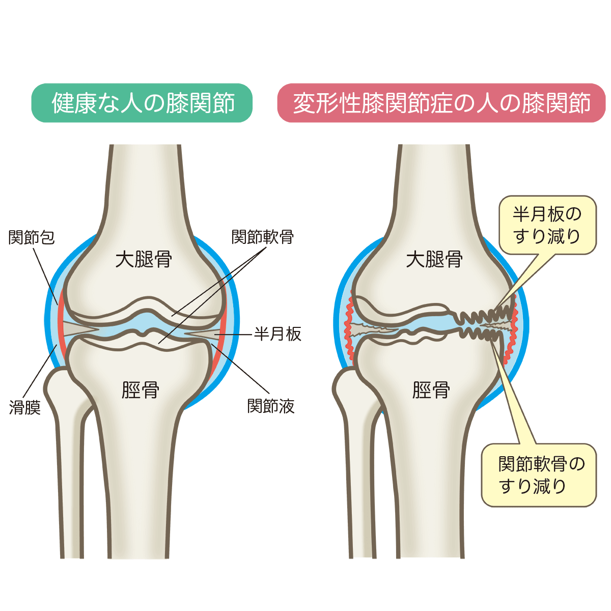 ひざの関節が痛くなる、動かしにくくなる、主に年齢とともに進行する疾患です。